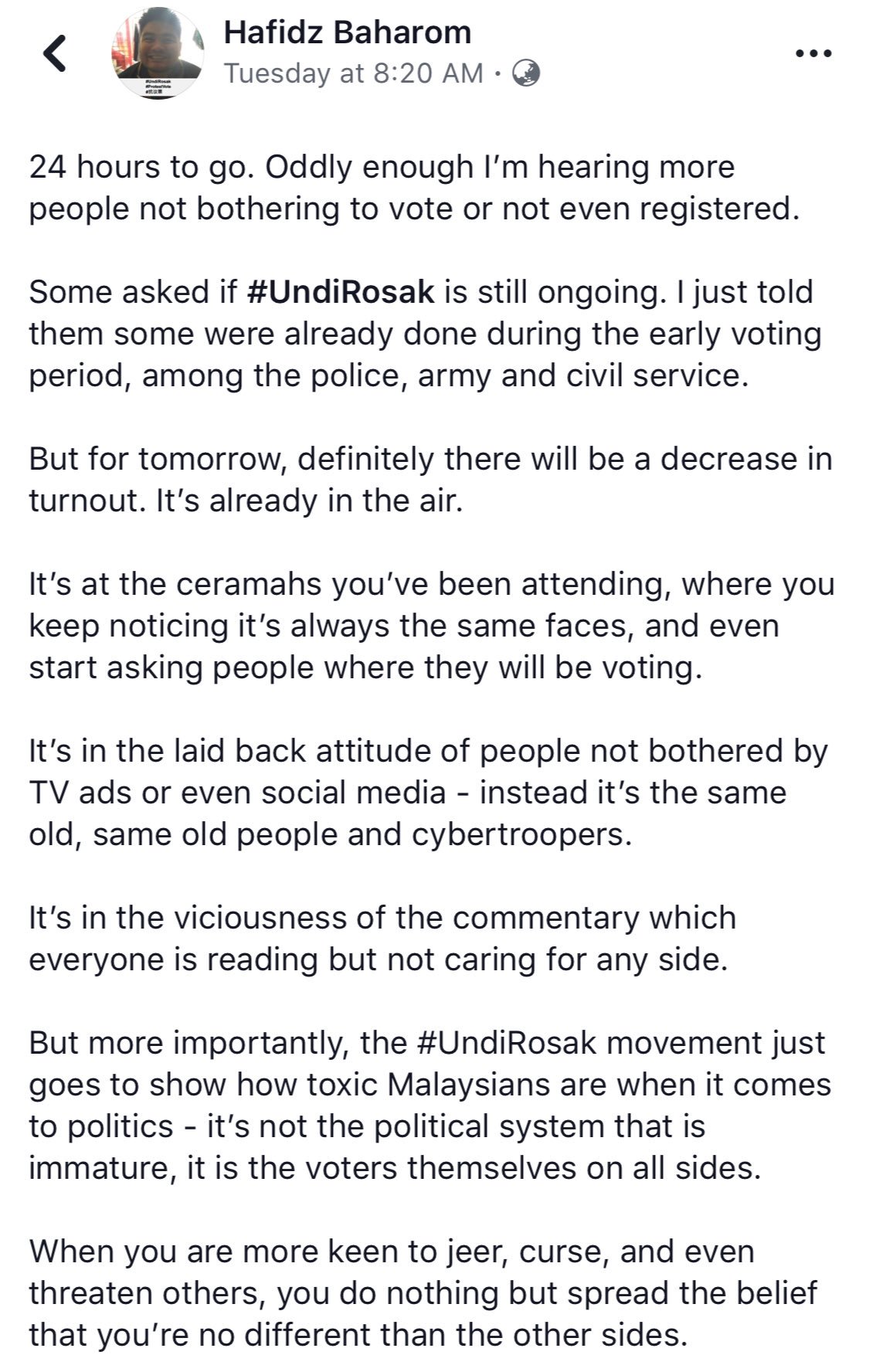 There are bigger reasons why and undi rosak is not the reason, she added. Arutchelvan (better known as arul) is typing in answers to my questions on the psm campaign in the country's general election on may 9. Don't be fooled by this latest coordinated campaign just unleashed to encourage young voters stay at home. It was strange and odd that tun dr mahathir has to react and accuse umno as behind the #undirosak movement.it only gave credibility to the call.