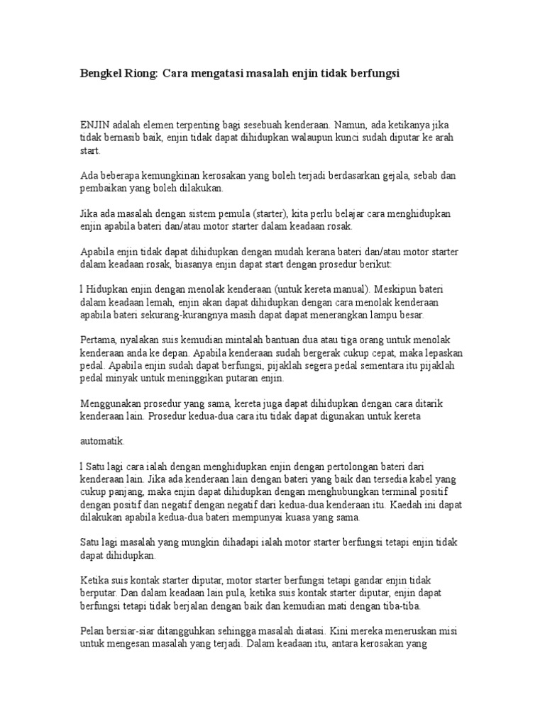 Masalah bila pasang aircond kuat enjin mati atau kadang2 jerking walaupun semasa tgh memandu. Apabila enjin dihidupkan, maka alternator akan terus berfungsi untuk menjana kuasa elektrik. Kos untuk membeli engine & gearbox treatment jauh lebih rendah dari kos anda hantar kereta ke bengkel disebabkan oleh enjin dan gearbox yang telah rosak. Starter motor yang telah rosak.